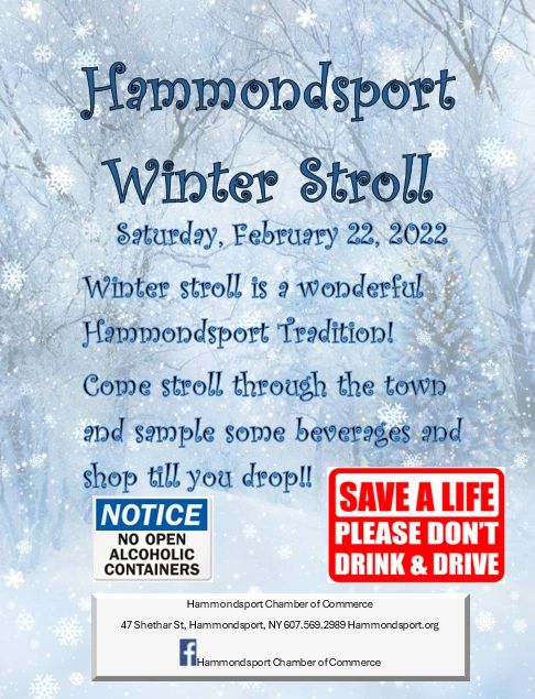 We can't wait to see you for the Hammondsport's Winter Stroll February 22, 2025. Take a walk and talk with others in this wonderful event! Enjoy food, drinks, and shops all around town.