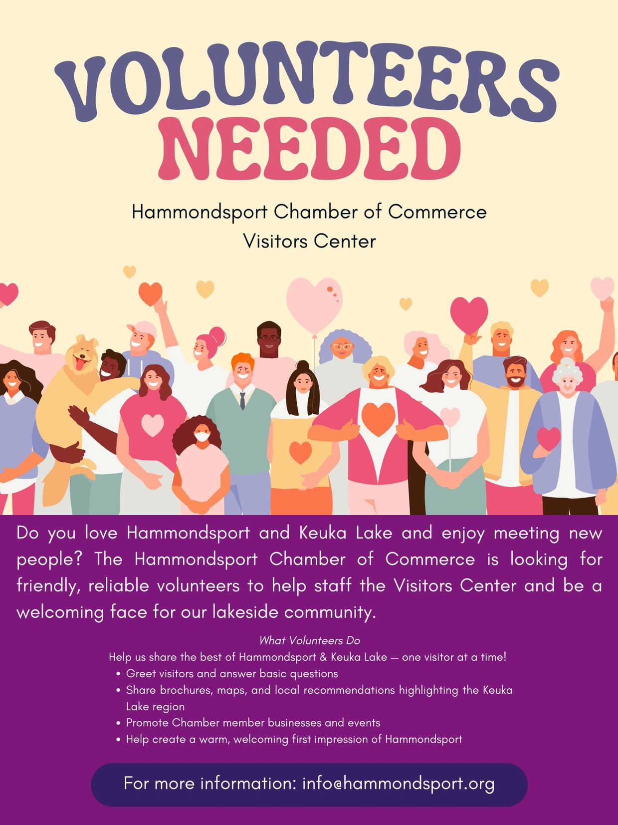 Do you love Hammondsport and Keuka Lake and enjoy meeting new people? The Hammondsport Chamber of Commerce is looking for friendly, reliable volunteers to help staff the Visitors Center and be a welcoming face for our lakeside community.